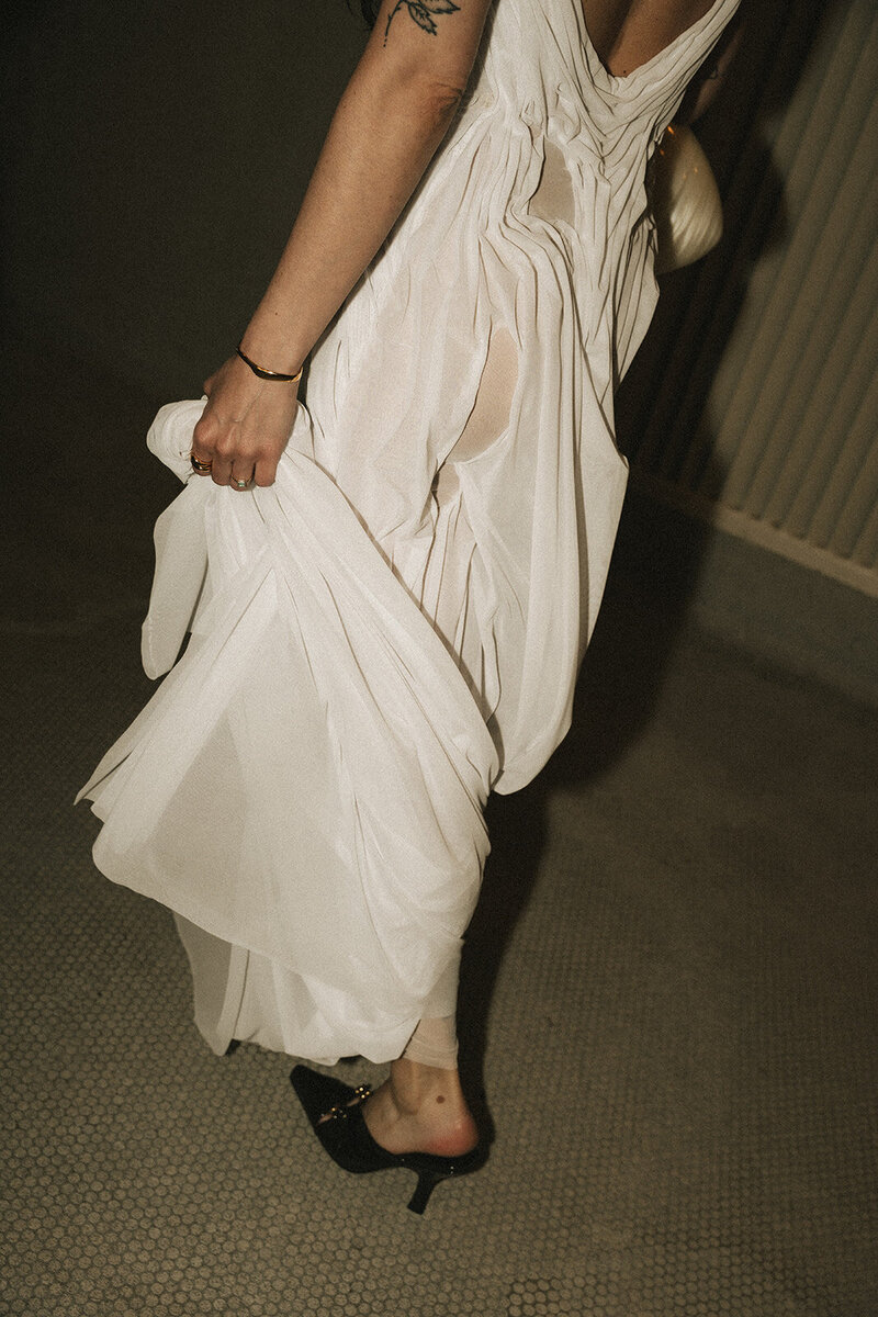 After the hotel, we made a quick trip over to Bushwick to the most unique and cool wedding venue. Syndicated has a bar area that absolutely GLOWS when the afternoon sun streams in. It perfectly lit up the glittering disco ball decorations. The actual theatre where the ceremony was held also has a cozy retro vibe and it was the perfect setting for this playful wedding.